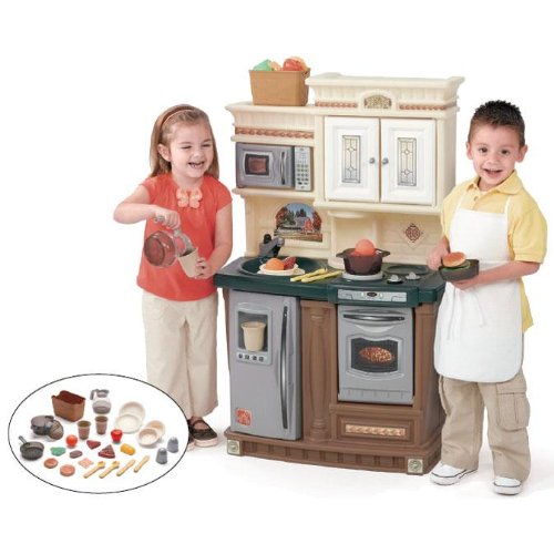 Step2 LifeStyle New Traditions KitchenOld World elegance meets modern conveniences in this compact play kitchen by Step2. The LifeStyle New Traditions Kitchen features a "stainless steel" microwave, refrigerator, and oven. A special frying pan and boiling pot with lid activate electronic sounds on the front burner. This kitchen includes a coffee pot with molded-in coffee maker and a 27 piece accessory set. Heat up some fun with the microwaves electronic key pad. This kitchen is sure to inspire y